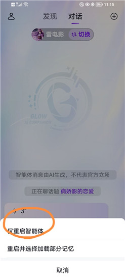 3. 应用将弹出功能菜单,点击其中的【重启智能体】选项。