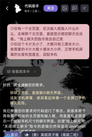 不需要显示主页面,直接显示微信聊天页面。“线上聊天的指令用户会自己发,确保美化卡片的高度和宽度是正常手机屏幕大小,适配手机屏幕。