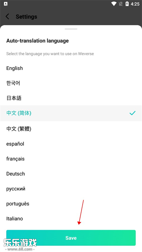 3. 在语言列表中选择简体中文,然后点击页面底部的Save按钮保存设置。