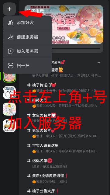 1、打开应用后,点击左下方的“KOOK”区域,再点击左上角的“+”图标,在弹出的菜单中选择“添加好友”;