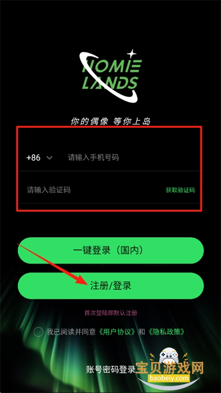 4、也可使用手机号配合验证码进行快捷登录,点击注册或登录按钮即可进入。
