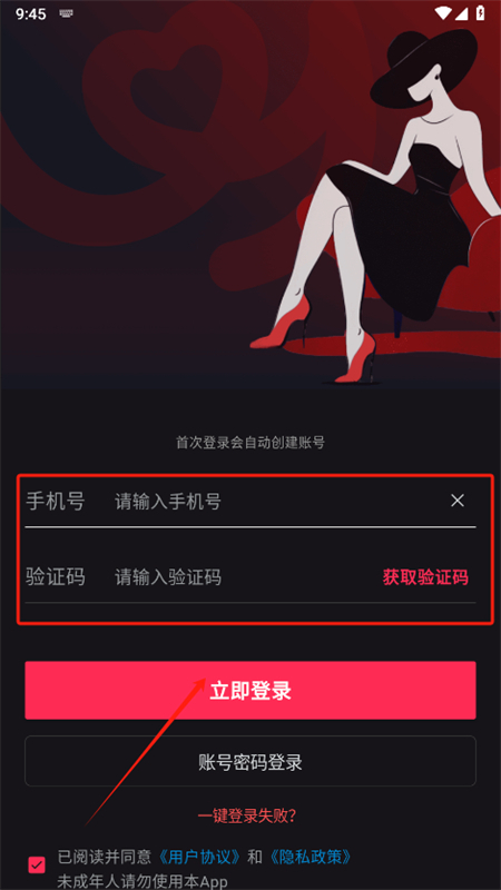 2、输入手机号和验证码即可快速完成注册并登录;