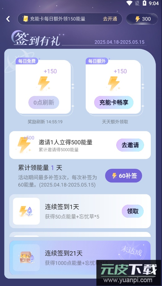 2、如图所示,每日签到即可领取能量,连续签到还能拿到额外奖励;邀请一人可获得500能量,累积最高可得5000能量。