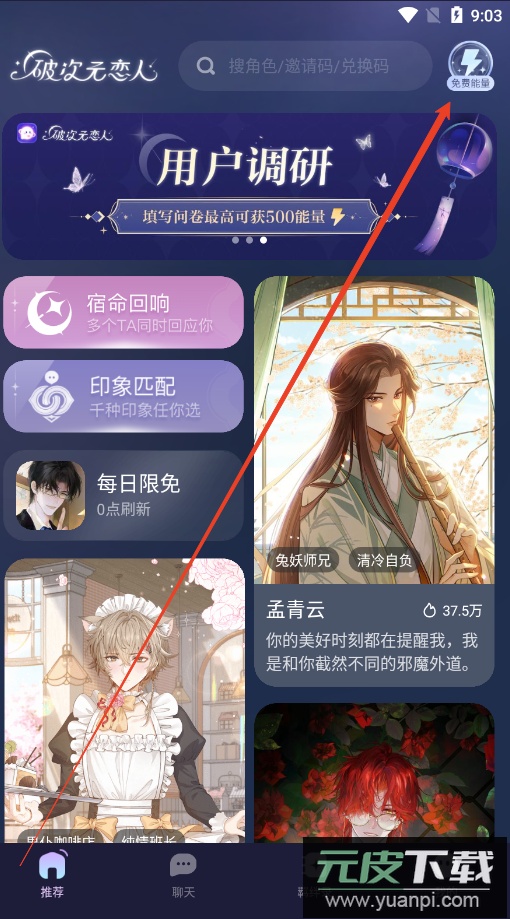 1、在推荐页面,点击右上角的“免费能量”进入。