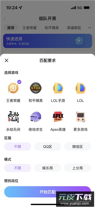 4、使用快速进房功能,选定游戏、区服、模式和段位后,能实现秒速匹配,无需等待。