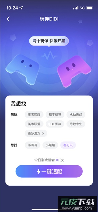 2、在玩伴DIDI界面,选择你想游玩的游戏,点击一键速配即可开始寻找伙伴;