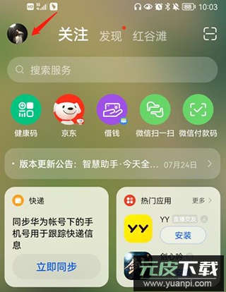 1、在手机主屏向左滑动至搜索页面,点击右上角头像图标。