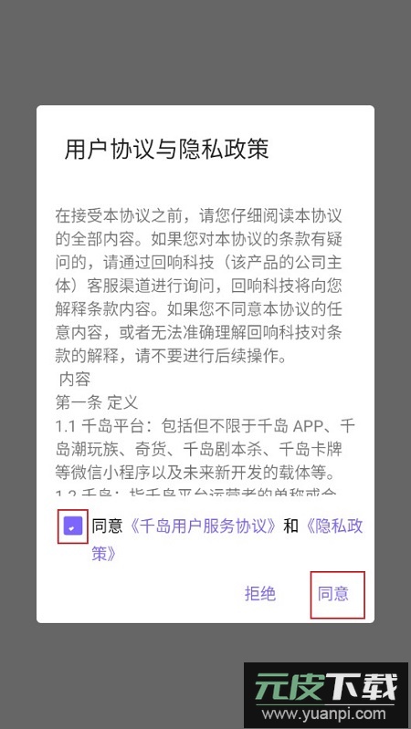 2、第一次进入软件会弹出千岛用户服务协议、隐私协议提示,勾选上以后点击同意按钮;