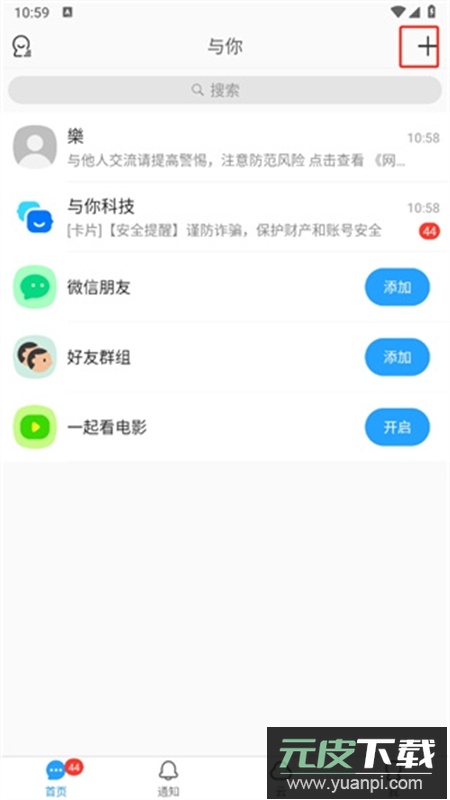 1、打开与你app进入首页,查看当前聊天列表,点击右上角加号图标;