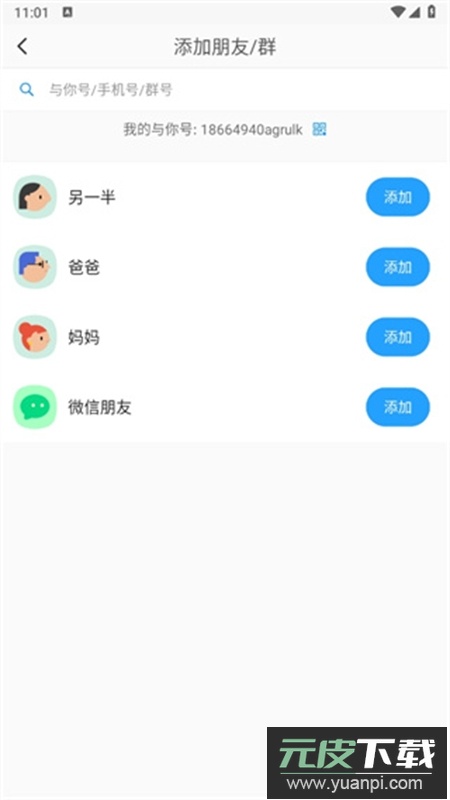 3、跳转至添加页面后,输入对方的与你号或手机号,点击添加按钮发送请求。