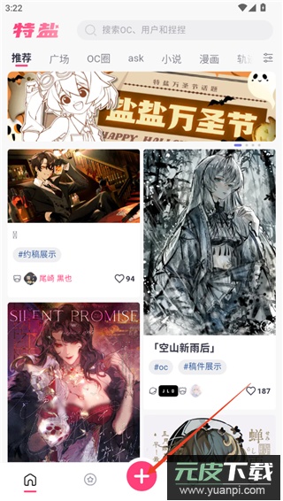 1、打开应用后,在浏览众多原创角色作品的基础上,点击界面下方的加号开始创建;