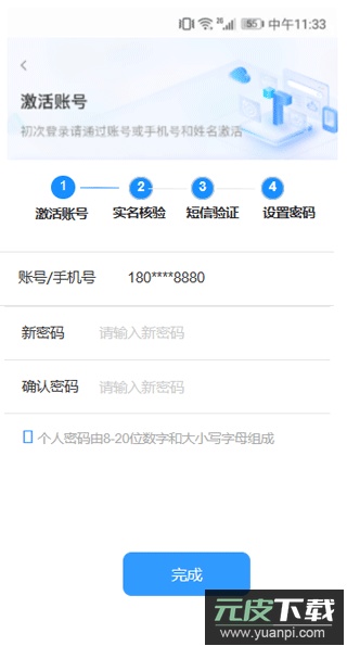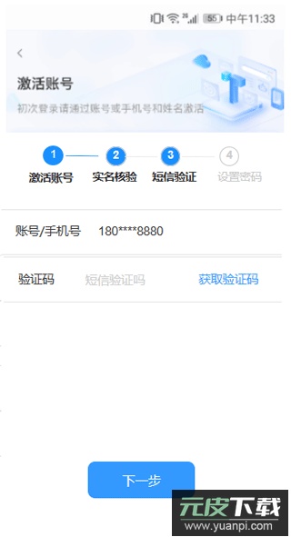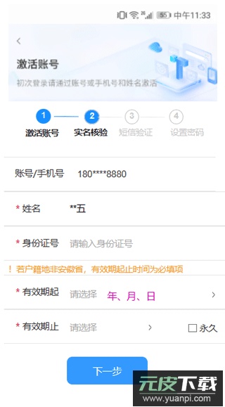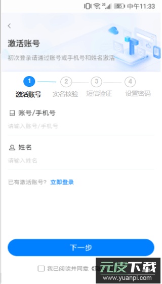 输入账号或手机号及姓名,验证账号是否已激活;若已激活则直接跳转登录页,未激活则点击下一步;