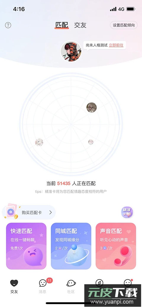 2、点击交友板块,快速匹配同城好友或进行声音匹配;查看系统推荐的朋友列表。