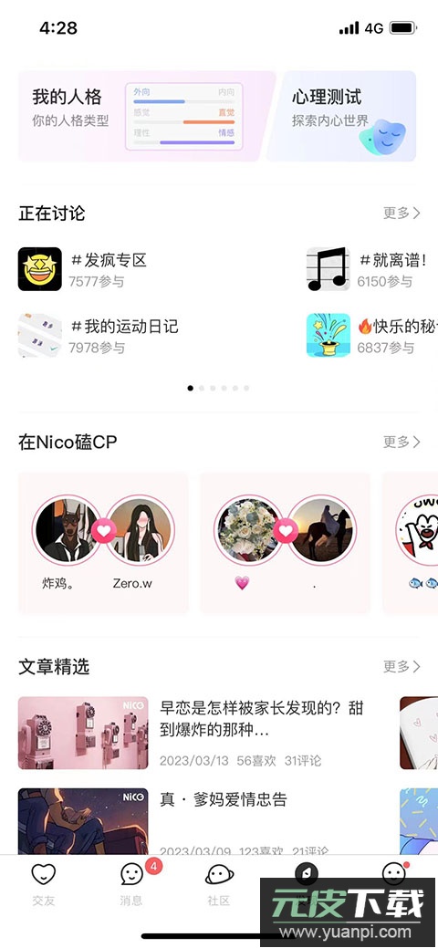 4、在发现页参与心理测试,加入热门话题讨论,阅读平台精选的优质文章。