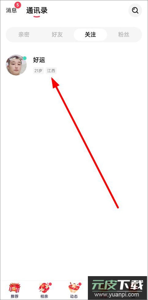 2、在通讯录页面浏览关注列表,点击关注对象的头像;