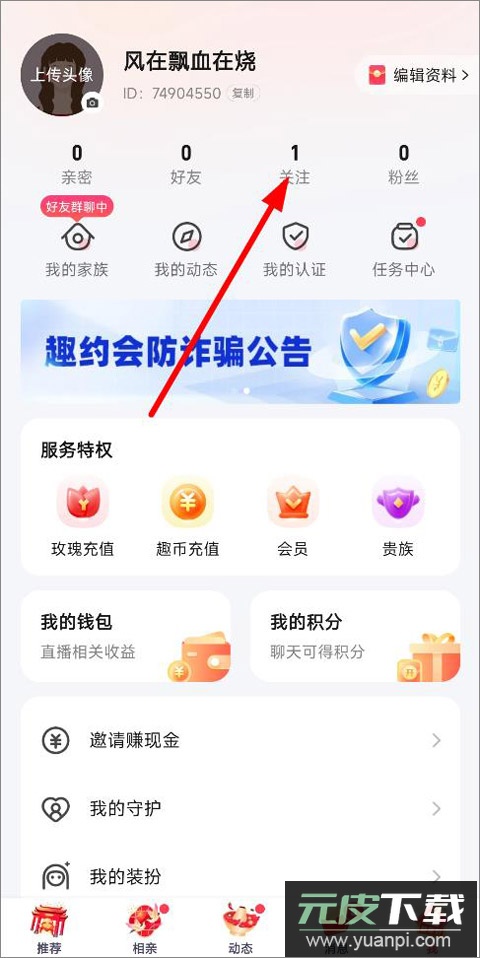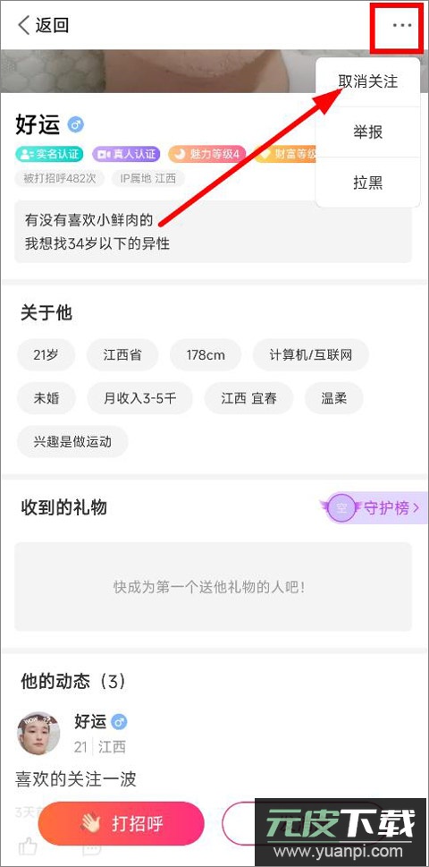 4、跳转至对方基本信息页,查看其ID、动态与个人资料,点击右上角“...”选项即可取消关注。