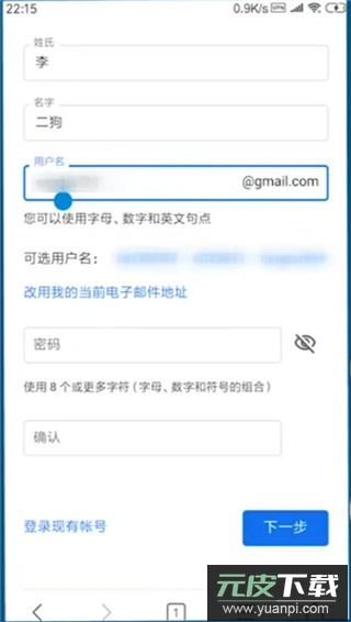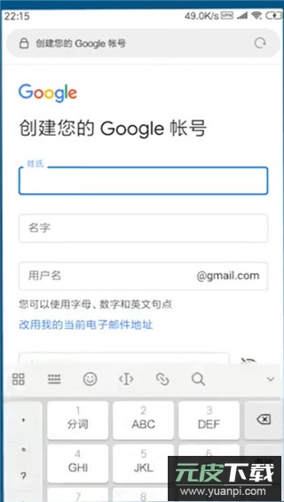 5、进入账号创建页面,依次填写姓氏、名字并设置想要的邮箱地址;