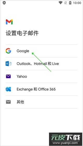 2、在设置电子邮件页面中选择第一个选项,即Google;