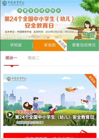 模块一:观看“安全教育视频”,观看完成后点击“已完成观看,请点击确认”。