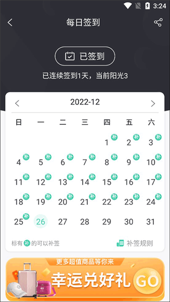 或许有用户注意到签到日历中部分日期标注有补字,这表示当天未进行签到,系统为用户提供了补签机会,但补签需满足一定条件:每补签一天需消耗100阳光值,且补签仅计入连续签到天数,不会获得当日签到对应的阳光奖励。