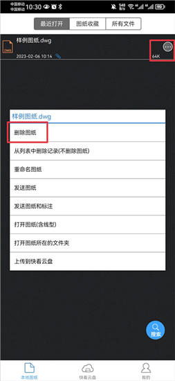1、打开软件本地图纸列表,在需要删除的图纸项右侧点击三点按钮,选择删除操作。