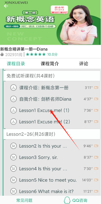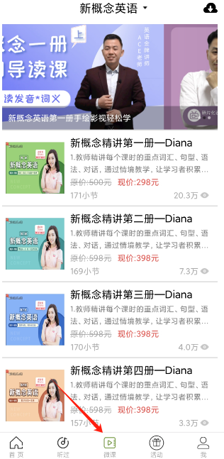 4、点击底部微课程栏目,即可便捷查看新概念英语的相关学习课程。