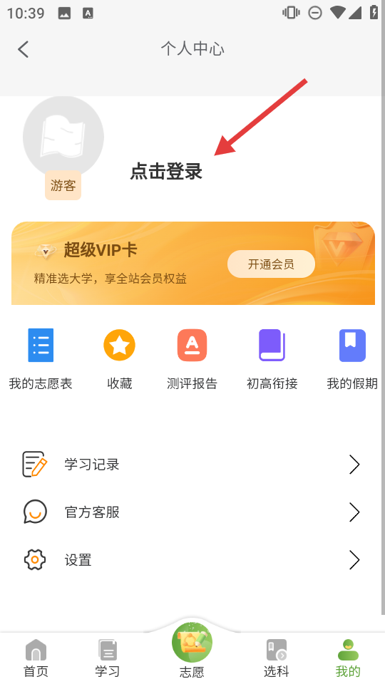 3、进入我的页面,点击登录,即可使用我的志愿表、收藏、测评报告等功能,管理个人升学数据。