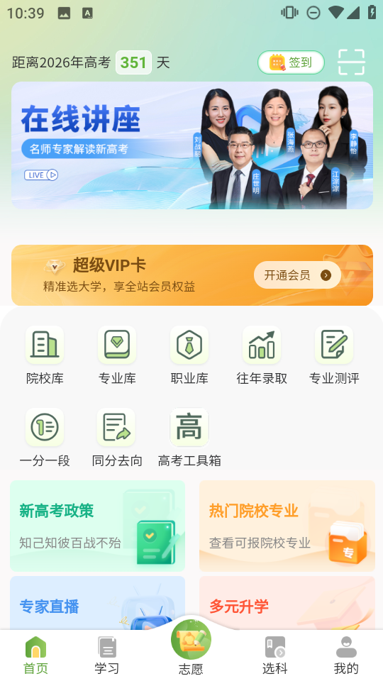 2、首页可浏览在线讲座、院校库、专业库,或查看新高考政策、热门院校专业相关内容,提前规划升学方向。