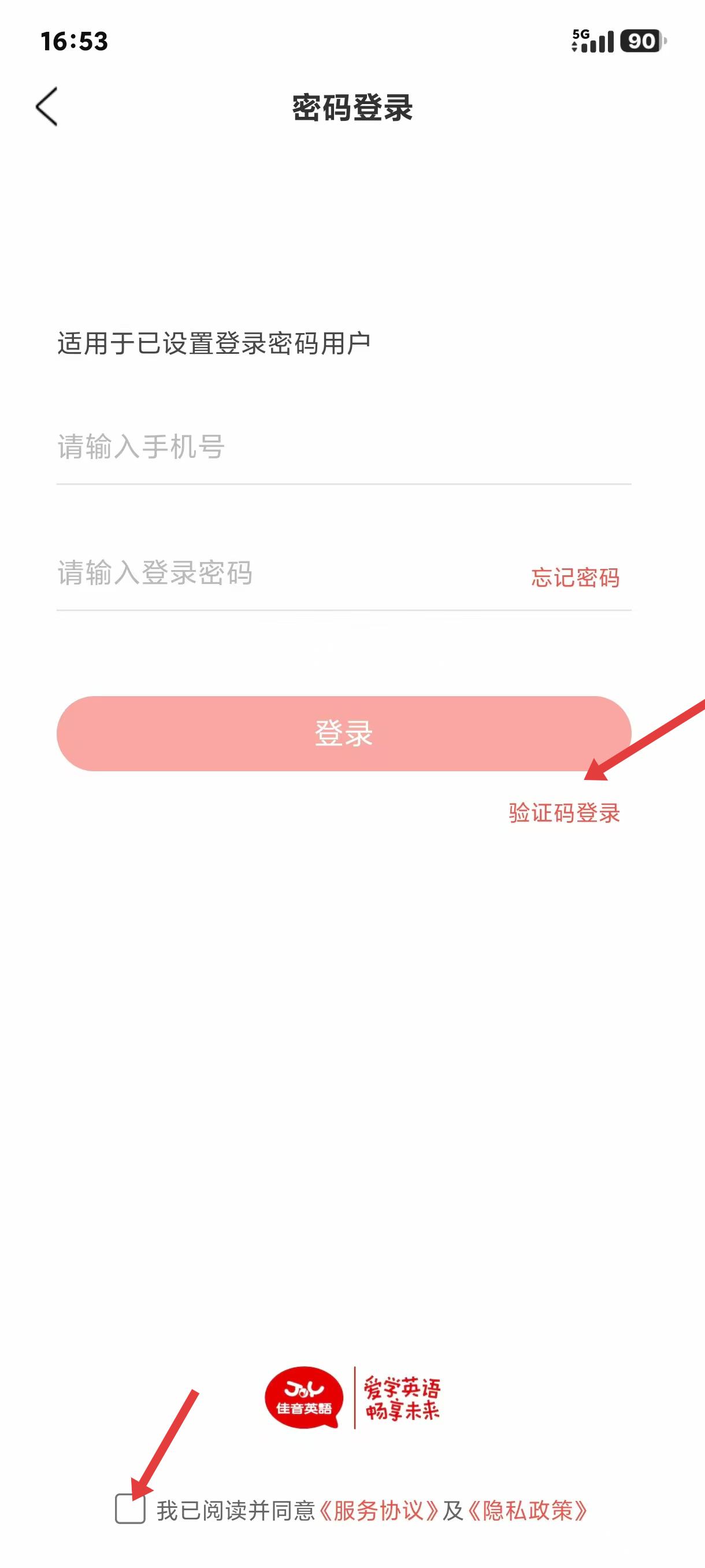 2、跳转至密码登录页面后,页面清晰显示手机号、密码两个输入栏,下方设置登录按钮,旁边有验证码登录的切换入口,底部需要勾选用户协议才可进行后续操作;
