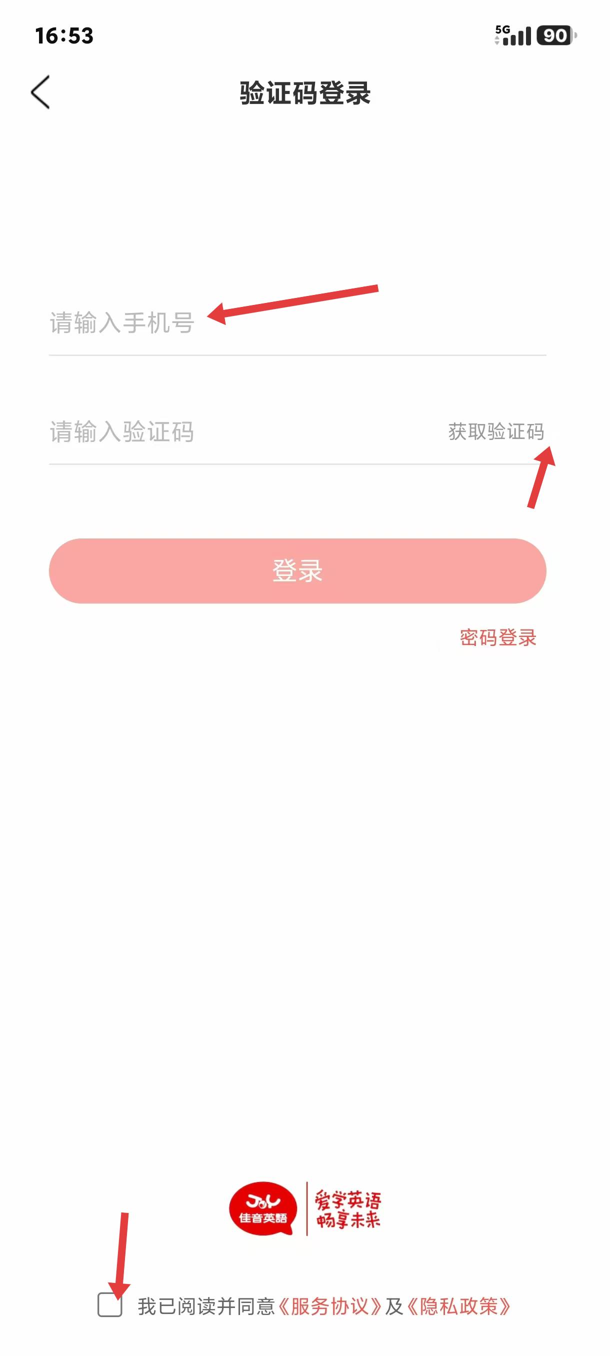 3、切换到验证码登录界面后,按提示依次输入手机号、获取并填写对应验证码,勾选协议后点击登录即可完成操作,整体流程简单,适配快速登录的使用需求;