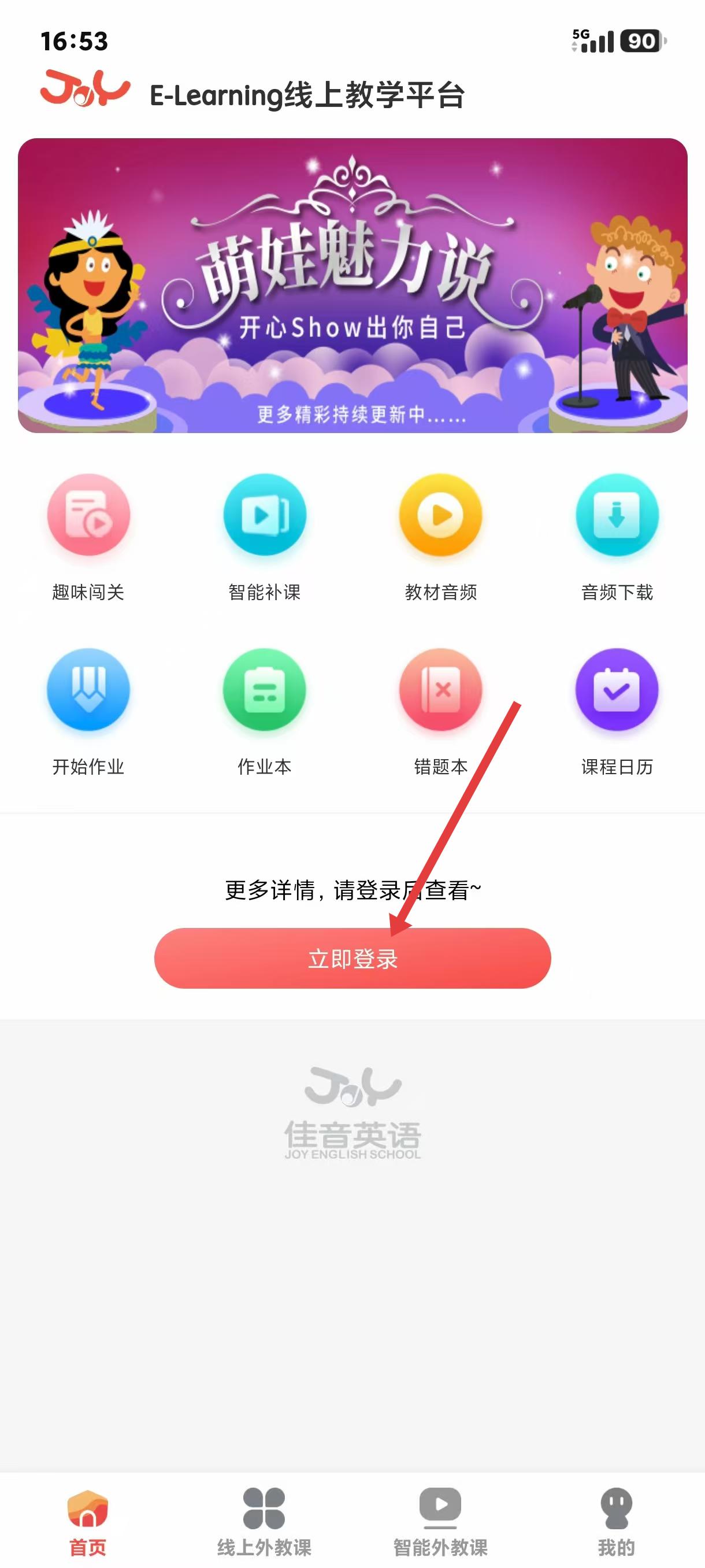 1、进入平台首页后,能看到趣味闯关、智能补学等功能图标,还有萌娃口语展示活动的宣传横幅,点击立即登录按钮即可解锁专属课程,优化英语学习使用体验;