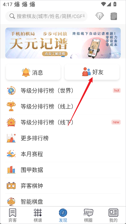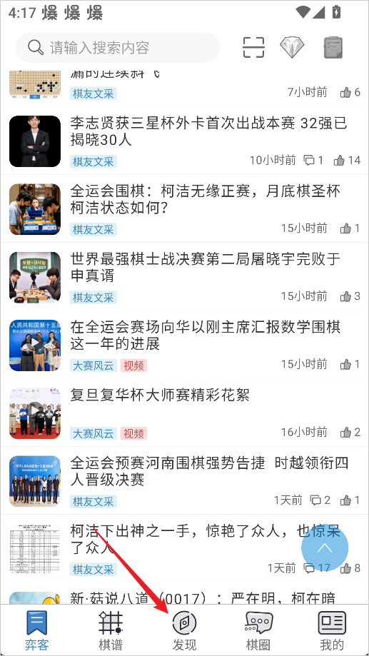 1、启动弈客围棋应用后,点击底部菜单栏的【发现】选项。