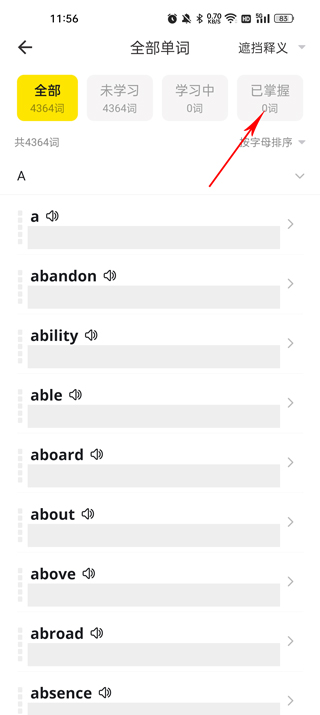 2、在全部单词页面中,切换到“已掌握”栏目,点击“选词重学”功能,勾选需要重置的单词,最后点击“重新学习”按钮即可。