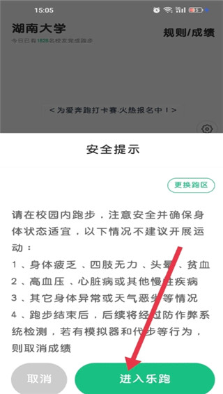 仔细阅读弹出的安全提示并同意相关条款,再次点击【进入乐跑】按钮即可进入;