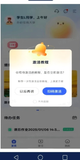 1、方式一:登录U校园AI版APP,如有待激活课程,页面将弹出提示窗口,点击扫码激活,扫描教材封底的验证码即可完成激活。