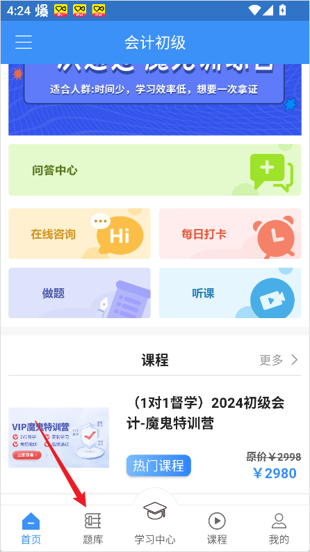 1、打开app,在底部导航栏点击【题库】。