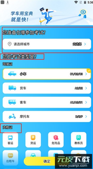 1. 打开软件后,首先选择所在城市以及计划报考的驾驶证类型。