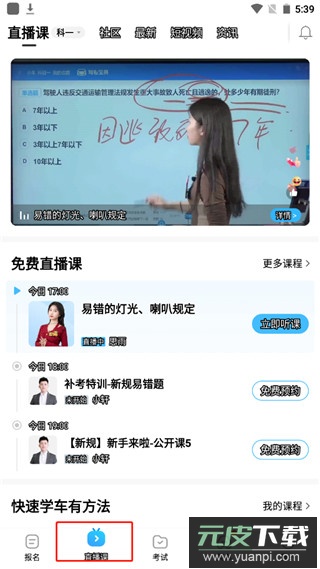驾考宝典普通版:功能更为全面,除了基础题库与模拟考试,还包含直播课程、科二科三的3D模拟练车、实拍视频教学以及驾校选择参考等内容,适合需要进行系统学习或长期备考的学员。