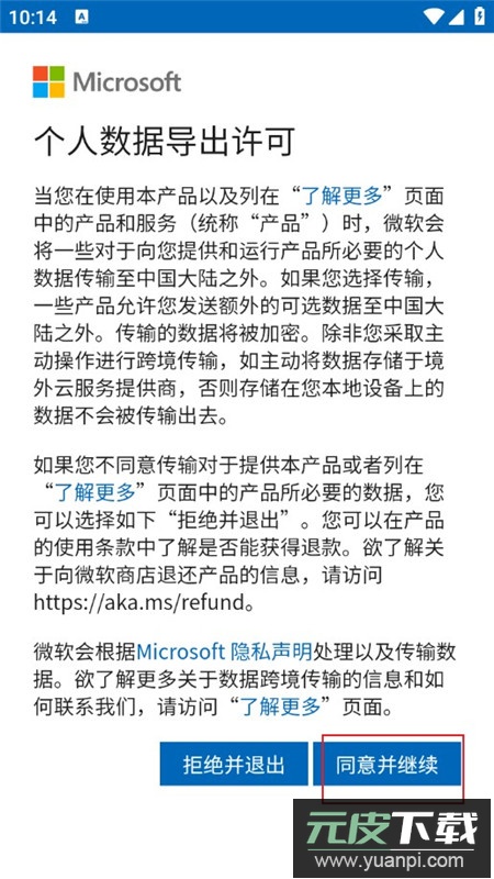 3、页面会弹出个人数据导出许可提示,点击同意并继续按钮;