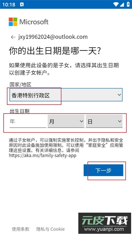 7、依次选择你所在的国家/地区,填写个人出生日期,点击下一步;