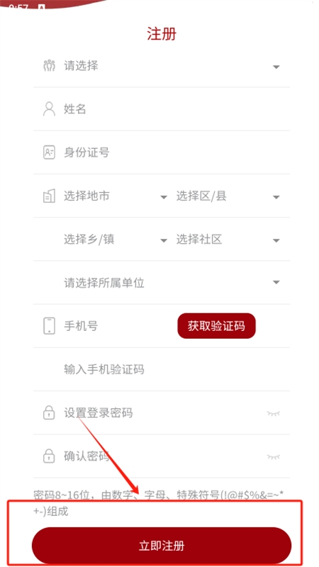 4、进入注册页面后,填写姓名、身份证号码等信息,设置登录密码,点击立即注册即可完成。