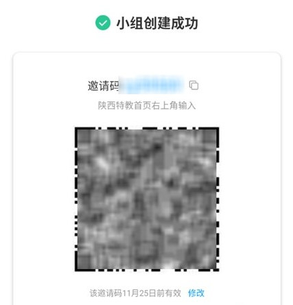 小组创建成功后,将生成邀请码与二维码,用于邀请新成员加入,点击完成即可;