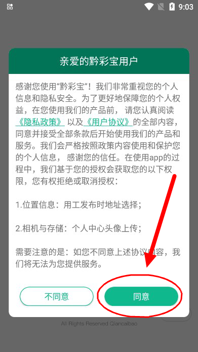 点击同意选项,确认隐私授权服务协议。