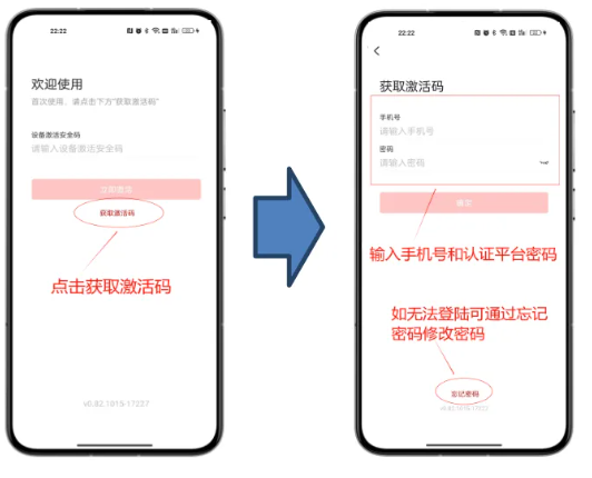 点击获取激活码,进入相应页面;输入手机号与闽政通办公APP密码,点击确定后激活码将以短信形式发送;输入短信中的激活码即可完成设备激活;