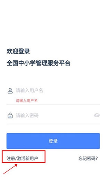 1、打开应用后,在家长登录页面点击左下角的【注册/激活新用户】。