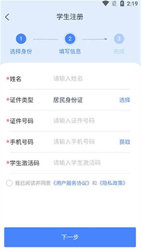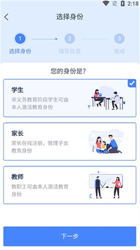 2、选择家长身份并勾选,点击【下一步】进入信息填写页;在此页面准确录入【学生激活码】等关键信息。