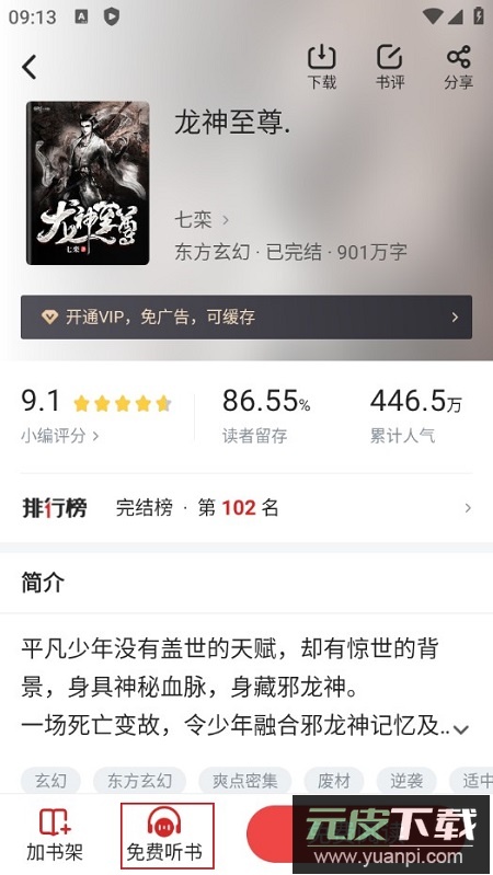 3. 进入小说详情页后,点击页面下方的免费听书选项,就能跳转至听书界面;