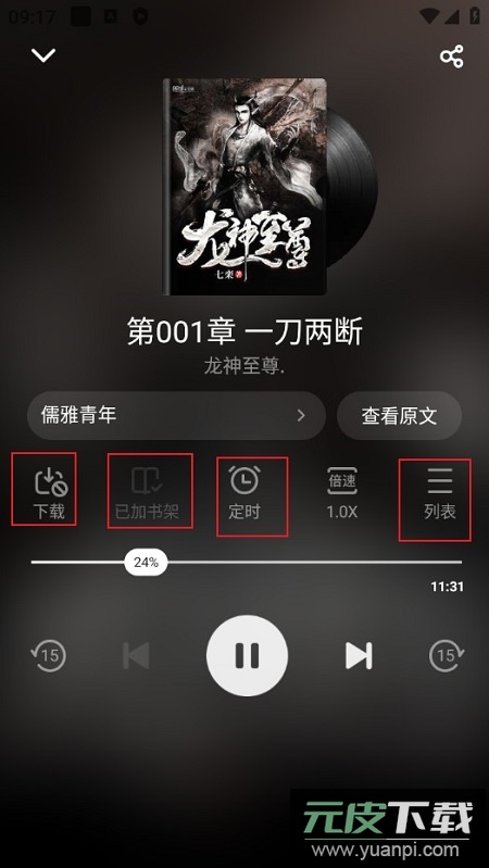 5. 在听书界面,你还可以使用资源下载、加入书架、定时关闭、查看当前小说目录列表等功能;