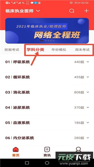 题库分为四个部分:技能考试、学科分类、历年模拟与周末考试。