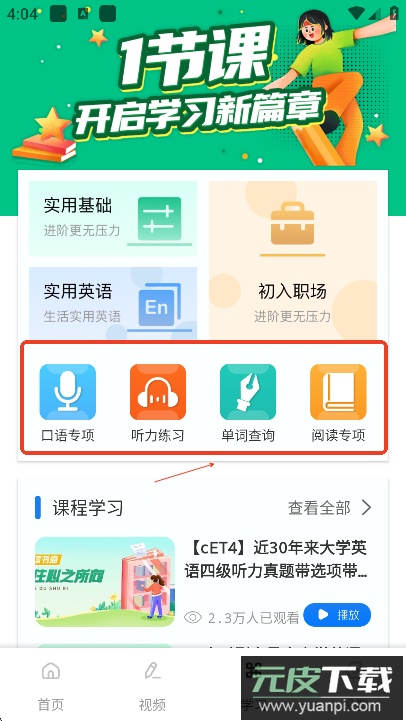具备一定基础的用户可在学习板块找到口语专项、听力训练、阅读强化等内容,通过系统练习提高英语水平。